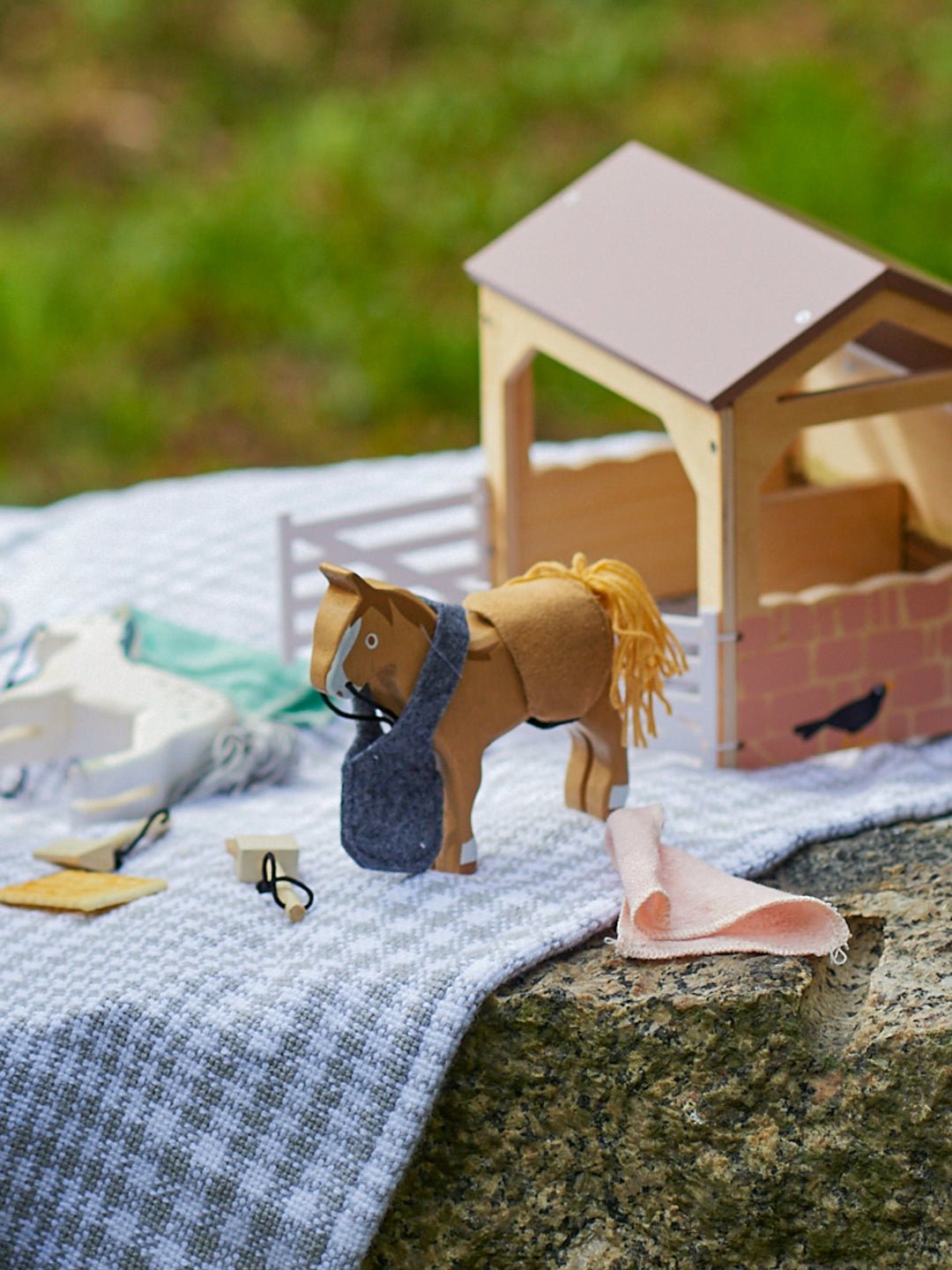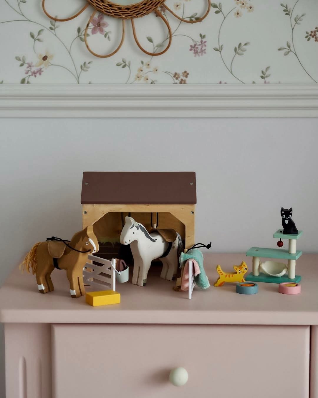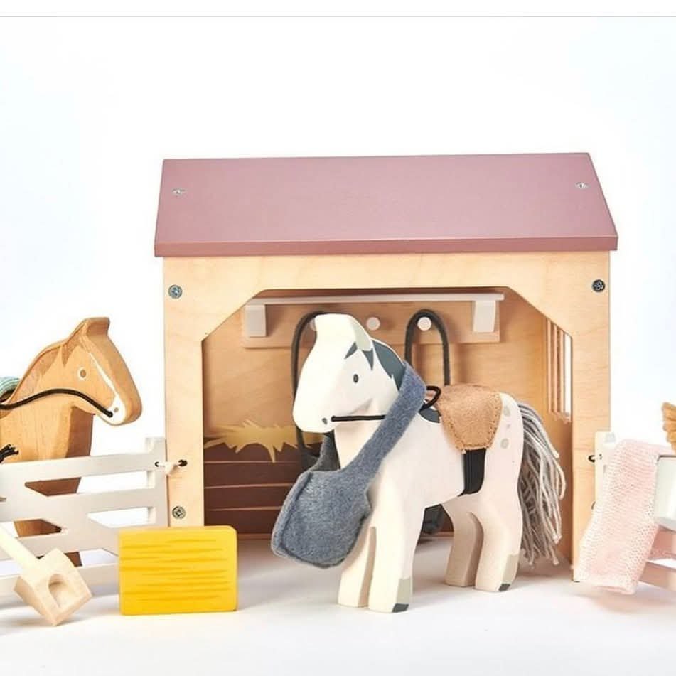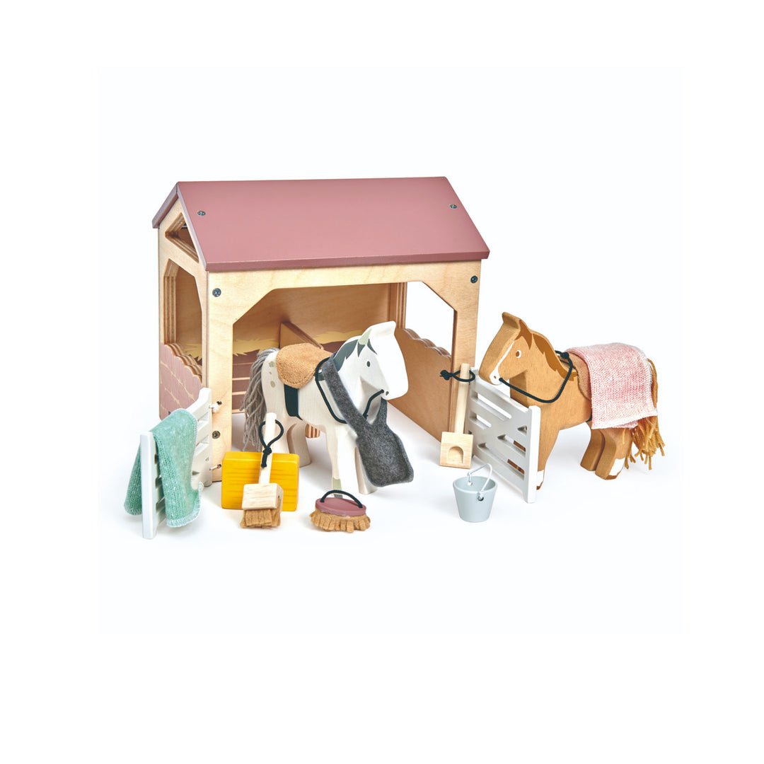 Este lindo establo es perfecto para el cuidado de los caballos. Este set incluye: 2 caballos con su mantilla de silla, rienda y una bolsa de comedero colgante; cepillo y cubeta para mantenerlos limpios, paca de heno para alimentarlos y escoba y pala para mantener todo ordenado. La escoba y pala se pueden colgar en el interior del establo utilizando los ganchos.