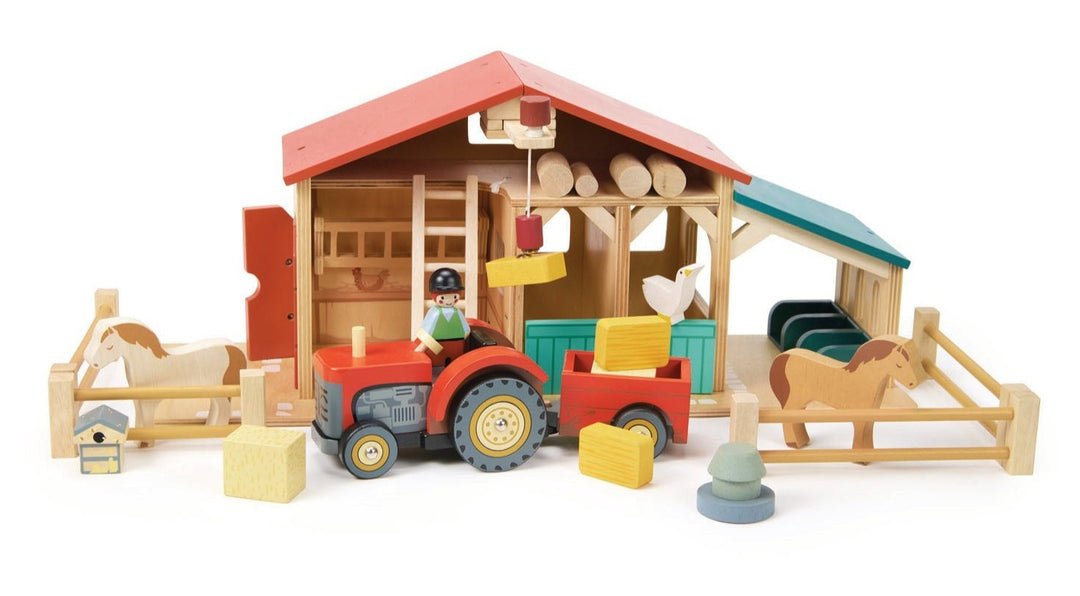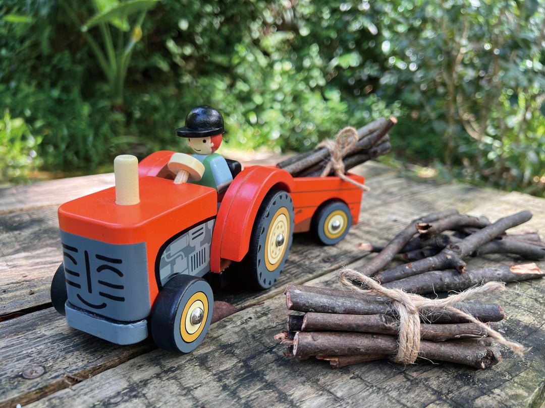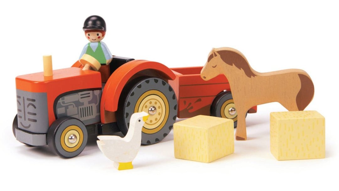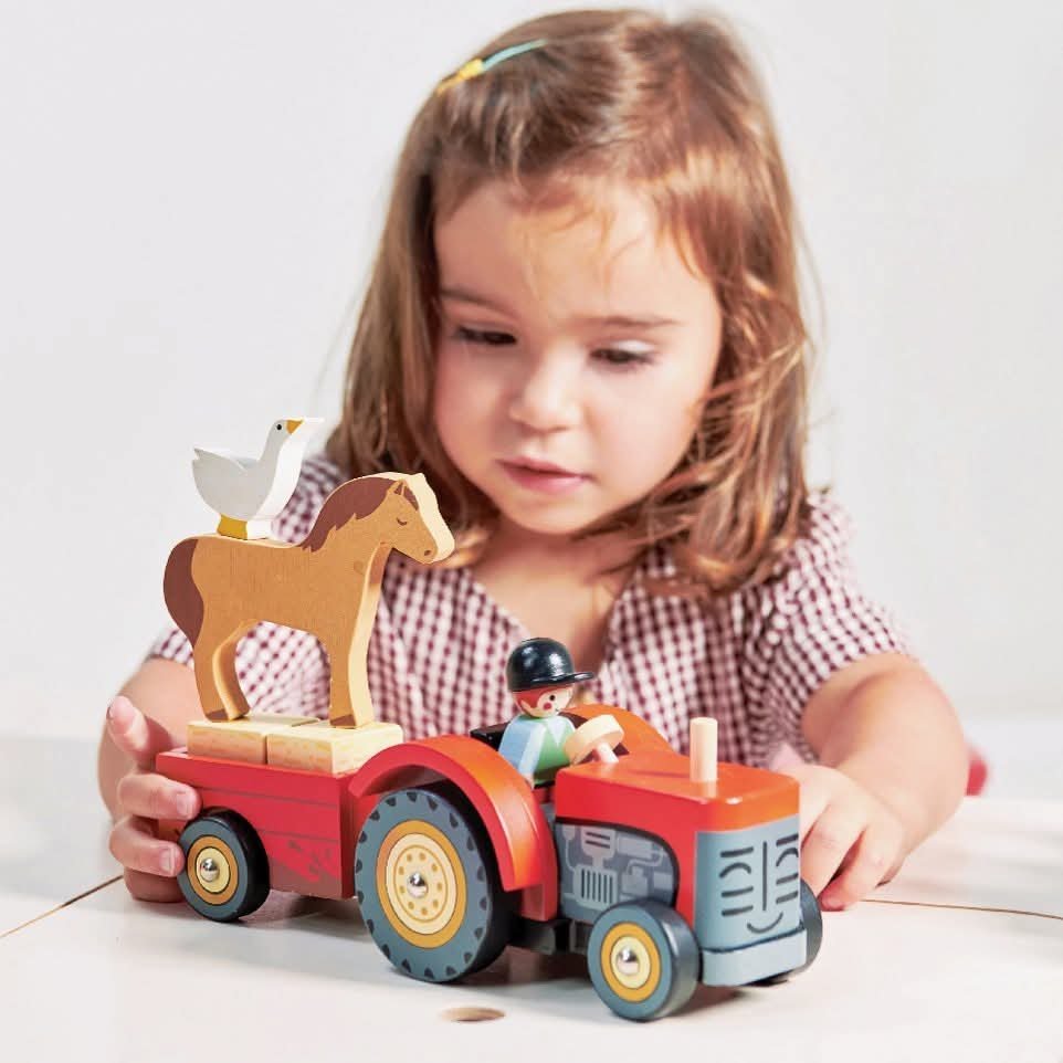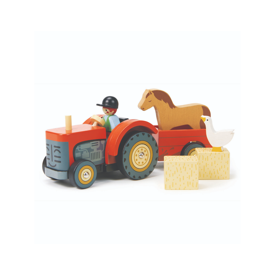 Un brillante tractor de granja color rojo con remolque desmontable conducido por un granjero, dos bloques de paja, un caballo y un ganso. Tu pequeño disfrutará transportar a los animales de la granja en su tractor. Ideal para juego de simulación.