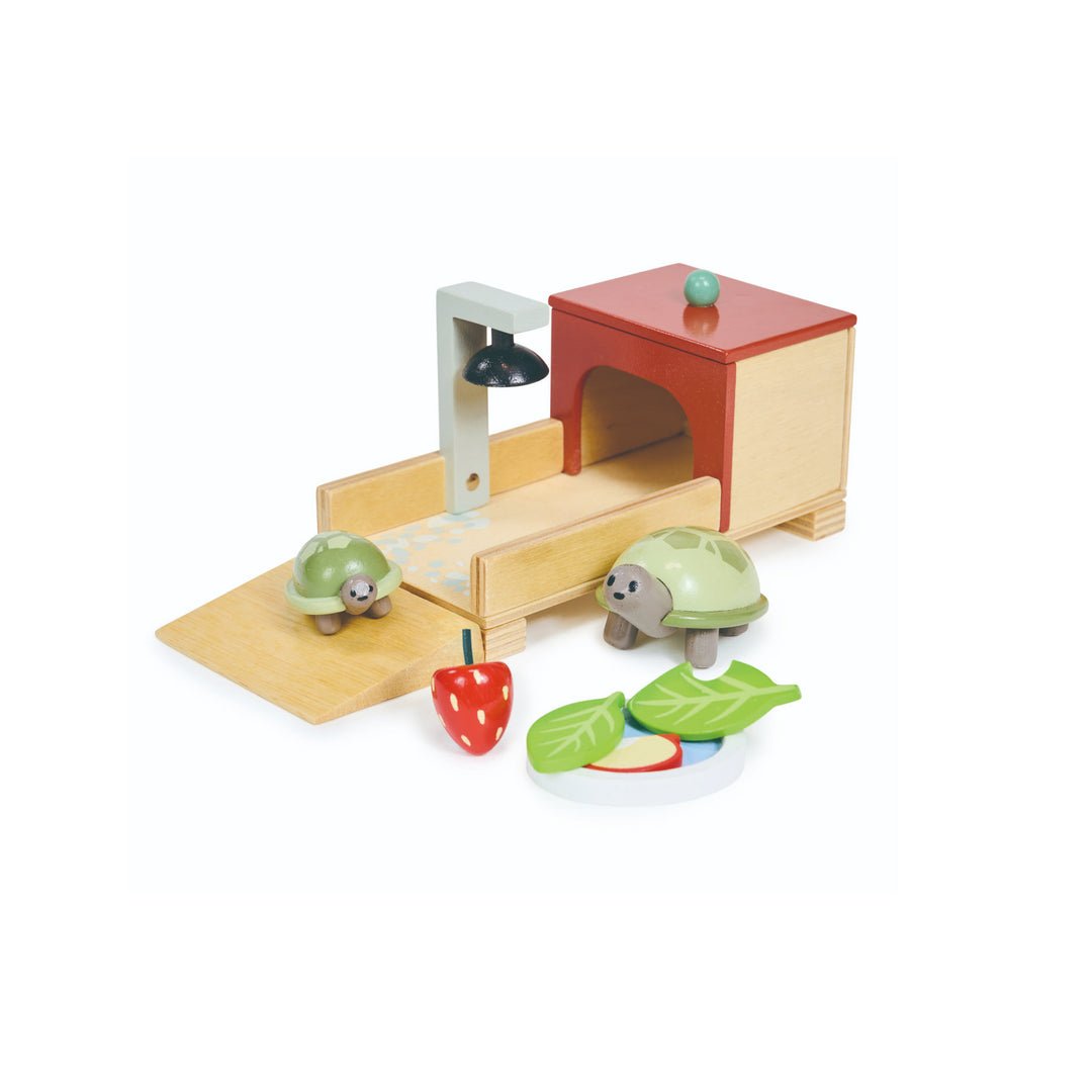 La mamá tortuga acaba de tener a su hermoso bebé a quien alimenta y cuida dentro de su bella casa. Este set incluye: Una tortuga mamá, una tortuga bebé, una lámpara de calor, recipiente de agua, dos hojas de lechuga, una rodaja de manzana y una fresa.